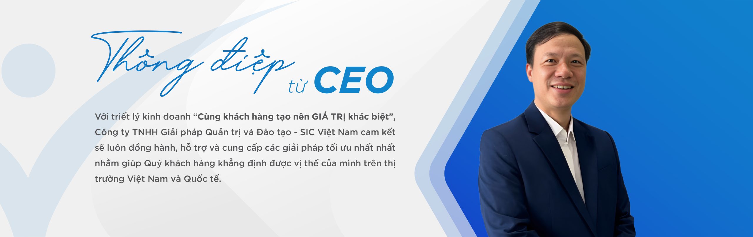 Với triết lý kinh doanh “Cùng khách hàng tạo nên GIÁ TRỊ khác biệt”, Công ty TNHH Giải pháp Quản trị và Đào tạo – SIC Việt nam (tên viết tắt: SIC Việt Nam) cam kết sẽ luôn đồng hành, hỗ trợ và cung cấp các giải pháp tối ưu nhất nhằm giúp Quý khách hàng khẳng định được vị thế của mình trên thị trường Việt Nam và Quốc tế.